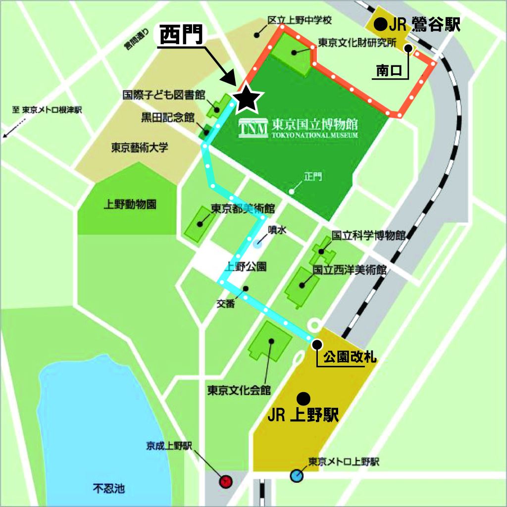 ・台東区循環バス「東西めぐりん」で上野駅・上野公園バス停から乗車し、1つ目のバス停が東京国立博物館前(2分)。